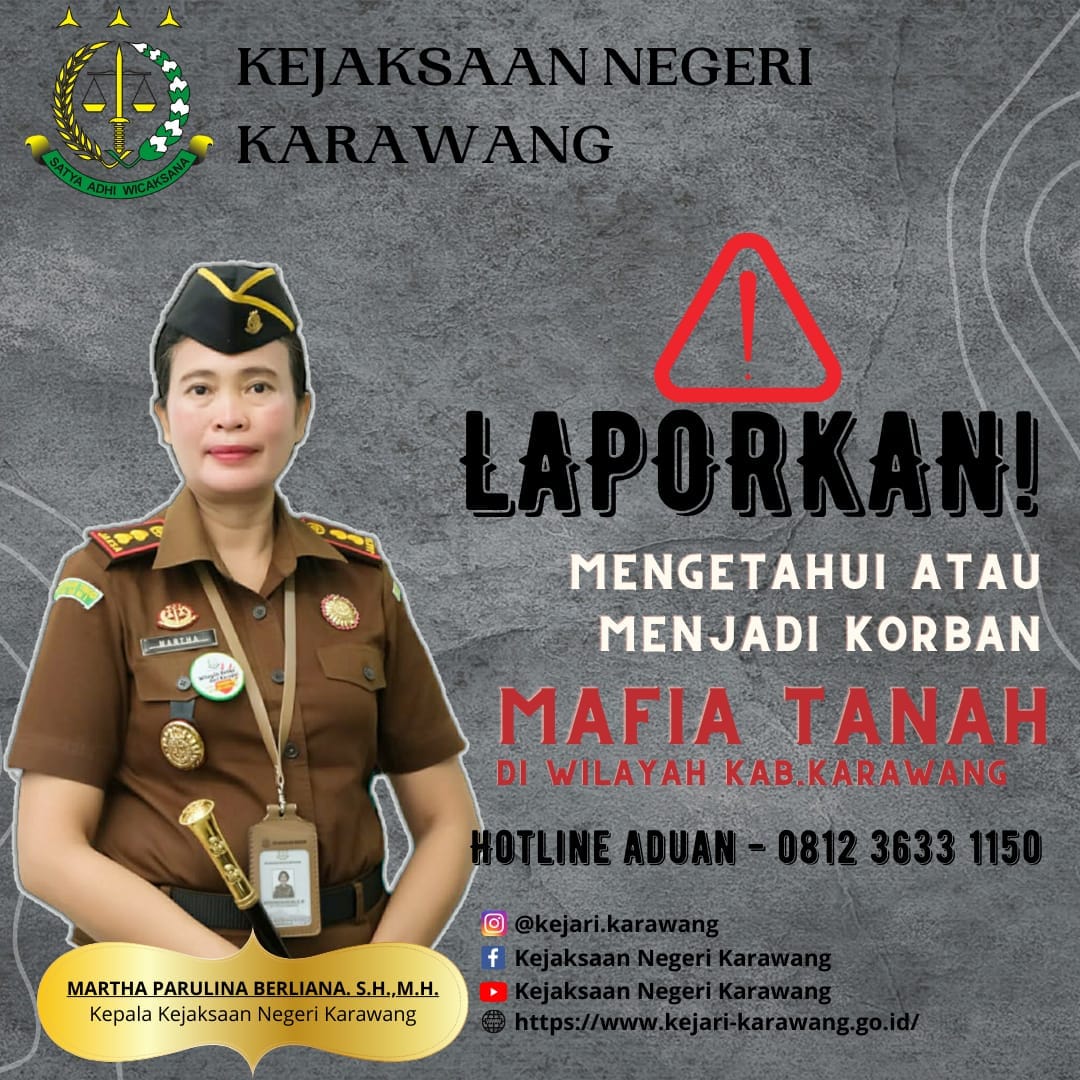 Jl. Jaksa Agung R. Suprapto No. 4 Karangpawitan, Kelurahan Nagasari, Kecamatan Karawang Barat, Kabupaten Karawang, Jawa Barat, 41312 Tlp/Fax : (0267) 405087 | Email : kejari.karawang@kejaksaan.go.id